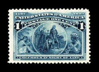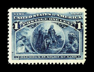 241 nhu 230 image#230, 1c Columbian, an outstanding mint single that is extraordinarily well centered within remarkably wide margins, bright fresh color on pristine white paper, o.g., n.h., an extremely fine large-margined gem; 2003 PSE certificate (XF-Superb 95 - how this didn't get a Jumbo designation we'll never know - SMQ $475.00). (Image) $57.50