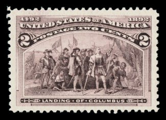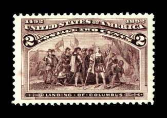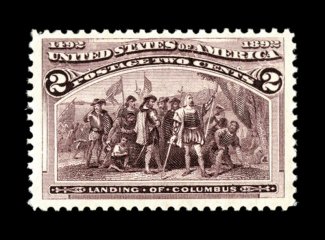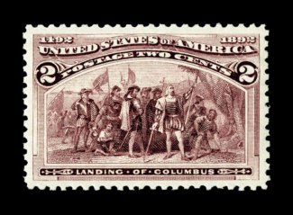 248 nh 231 image#231, 2c Columbian, exceedingly well centered within incredibly wide margins, strong rich color and a sharp impression, brilliant o.g., n.h., extremely fine; 2001 PF certificate (Image) $55.00