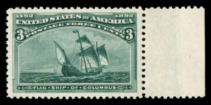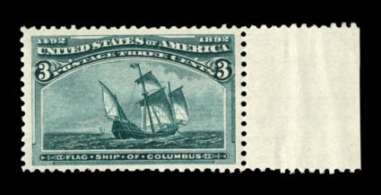 255 nh 232 image#232, 3c Columbian, right sheet-margin single, brilliantly fresh, gorgeous rich color and impression on bright white paper, well centered, pristine o.g., n.h., extremely fine; 2002 PF certificate. (Image) $150.00