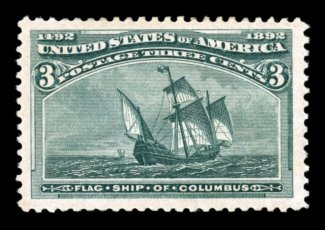 253 ogu 232 image#232, 3c Columbian, choice centering within large margins, deep rich color, o.g., lightly hinged, extremely fine; 2004 PSE certificate (XF-Superb 95; SMQ $205.00). (Image) $60.00