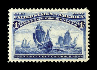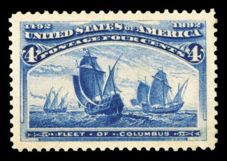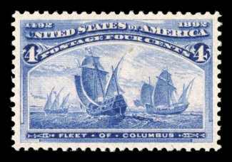 260 nhu 233 image#233, 4c Columbian, a most impressive mint single, featuring outstanding centering amid lavishly large and balanced margins, sumptuously rich color and a crisp impression, o.g., n.h., extremely fine gem; 2006 PSE certificate (XF-Superb 95; SMQ $1,800.00). (Image) $220.00