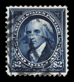 322 O 262 image#262, $2.00 Bright blue, choice used example of this scarce and difficult dollar value, fresh with deep luxuriant color and a detailed impression on white paper, exceedingly well centered as well, cancelled with portion of duplex, extremely fine; this stamp is rarely encountered used in this premium quality; 1986 and 2006 PF certificate. (Image) $1,250.00