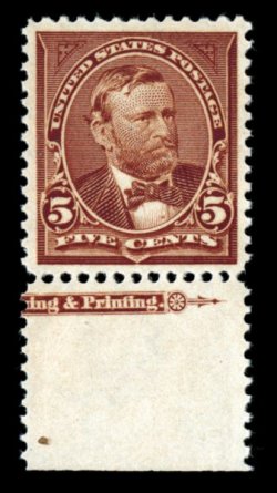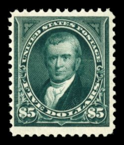 323 ogu 263 image#263, $5.00 Dark green, an incredibly choice mint example of this high value, one of the rarest regularly issued stamps of the United States, with only 25,000 copies having been issued, and only a tiny fraction of these still exist in the premium condition found on this exciting stamp, possessing near perfect centering amid large margins, intense color and a well incised impression on bright paper, full clean o.g., lightly hinged, extremely fine for this; 1979 and 1996 PF certificates, as well as a 2006 PSE certificate (VF 80 - unquestionably conservative in our opinion; SMQ $5,450.00); ex-Billington, Killien. (Image) $5,000.00