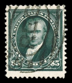 325 Ou 263 image#263, $5.00 Dark green, a most impressively margined used example of this rare high value, being wonderfully well centered within extravagantly large margins that are atypical of this issue, intense dark green color and razor-sharp impression which contrast well with its bright paper, neat central strike of oval registry postmark, extremely fine; a very difficult stamp to find in this choice used quality; 2006 PF certificate (XF 90; SMQ $4,600.00). (Image) $2,600.00