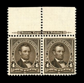329 nh 269 image#269, 4c Dark brown, an exceedingly handsome and choice full top margin imprint pair, extraordinarily well centered and margined, prooflike color and impression, o.g., n.h., extremely fine; a pair with exceptional eye appeal; 2002 PF certificate. (Image) $280.00