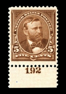 333 og 270 image#270, 5c Chocolate, bottom sheet-margin plate no. 192 single, extravagantly large margins at top and bottom, deep luxuriant color, o.g., certificate states "previously hinged", but it appears to us to be never hinged with a couple small gum skips, extremely fine; 2002 PSE certificate. (Image) $35.00