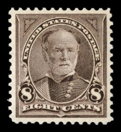 334 nh 272 image#272, 8c Violet brown, bottom sheet-margin plate no. 931 single, exceedingly well centered, deep rich color and a crisp impression, o.g., n.h., extremely fine; 2005 PF certificate for a strip of three from which this was taken. (Image) $210.00