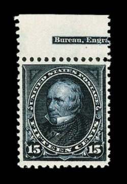 337 ogu 274 image#274, 15c Dark blue, intensely rich color and a deeply etched impression, exceptionally well centered within large margins, o.g. which current certificate calls previously hinged, although we disagree, extremely fine; photocopy of a 1994 PF certificate for the imprint strip of three from which this came, 2000 PF certificate as a single ("never hinged", top selvage removed), and a 2005 PSE certificate (VF-XF 85; SMQ $335.00). (Image) $250.00
