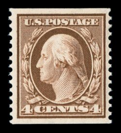 461 og 354 image#354, 4c Orange brown coil, perf. 12 vert., mint single, well centered and margined, strong rich color, o.g., lightly hinged, very fine; photocopy of a 1976 PF certificate for a strip of four, this being the second stamp. (Image) $220.00