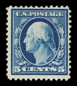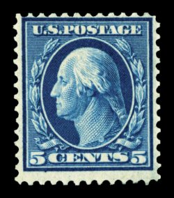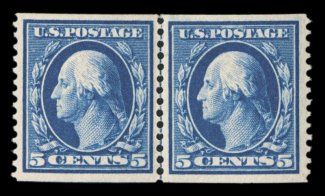 462 og 355 image#355, 5c Blue coil, perf. 12 vert., guide line pair, exceptionally well centered and margined, rich color and a strong impression, o.g., lightly hinged, extremely fine; 1987 PF certificate. (Image) $1,500.00