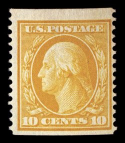 463 og 356 image#356, 10c Yellow coil, perf. 12 vert., brilliant color, fairly well centered within large margins, o.g., lightly hinged, nearly very fine for this rare coil; 1984 PF certificate. (Image) $3,000.00