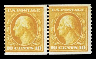 464 og 356 image#356, 10c Yellow coil, perf. 12 vert., pair, strong bright color, o.g. (light diagonal gum bend in right stamp), fine for this coil rarity. (Image) $6,750.00