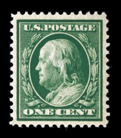465 nh 357 image#357, 1c Green on bluish paper, an incredibly choice mint single, being amazingly well centered within large and perfectly balanced margins, intensely rich color, pristine o.g., n.h., extremely fine; actually a very scarce stamp in this gem quality; 1998 PF certificate. (Image) $210.00