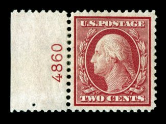 466 nh 358 image#358, 2c Carmine on bluish paper, an incredibly choice left sheet-margin plate no. 4860 single, perfectly centered amid extravagantly large margins, deep luxuriant color, o.g., never hinged, extremely fine; actually a challenging stamp to find in this gem quality; 1987 PF certificate. (Image) $190.00