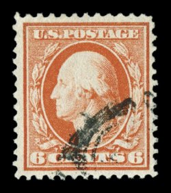 472 O 362 image#362, 6c Red orange on bluish paper, an extremely rare used single of this bluish paper, with strong bright color, well centered, lightly canceled with small portion of duplex pmk. that leaves the face cancel free, very fine and attractive; an enormously rare used stamp that virtually never appears at auction; only ten used copies of the Six Cent Bluish Paper have been certified by the Philatelic Foundation, of this tiny population, only four, including this example, are sound; 1984, 1988 and 2006 PF certificates. (Image) $5,000.00