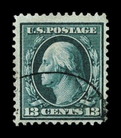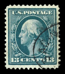 474 O 365 image#365, 13c Blue green on bluish paper, an amazingly well centered used example of this scarce bluish paper, featuring extraordinarily large balanced margins, fresh bright color and sharp impression, neat portion of Saginaw, Michigan oval pmk., very faint diagonal crease and tiny corner perf. crease at bottom left, neither of which detracts from this stamp's magnificent and extremely fine appearance; clear 1984 PF certificate and a 2006 PF certificate. (Image) $2,250.00
