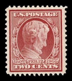 477 nh 369 image#369, 2c Lincoln on bluish paper, exceedingly well centered within especially large margins, strong color and impression, pristine o.g., n.h., extremely fine; 2005 PSE certificate for a block of four, this being the bottom left stamp. (Image) $425.00