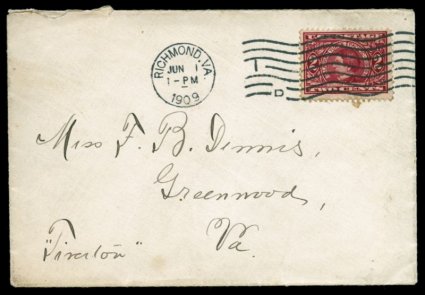 479 F 370 image#370, 2c Alaska-Yukon, tied by Richmond, Va., Jun 1, 1909 first day machine cancel on petite cover to Greenwood, Va., (June 1 backstamp), cover with slight edge dings at top left, stamp with a few gum soaked perf. tips, fine; a rare and seldom offered first day cover. (Image) $3,000.00