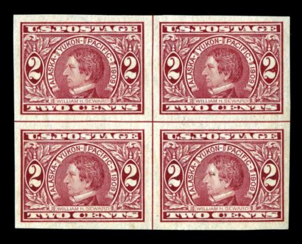 480 nhbl 371 image#371, 2c Alaska-Yukon imperforate, pristine center line block of four, full wide and beautifully balanced margins all around, bright color and fresh, flawless o.g., n.h., extremely fine. (Image) $175.00