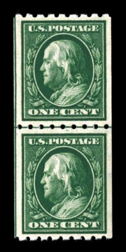 501 nh 390 image#390, 1c Green coil, perf. 8 1/2 horiz., guide line pair, wonderfully well centered within very large margins showing guide line at left, brilliantly fresh, with intense color, o.g., n.h., extremely fine. (Image) $80.00