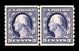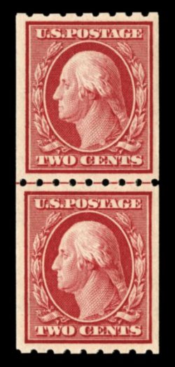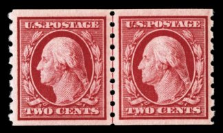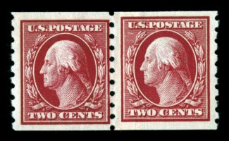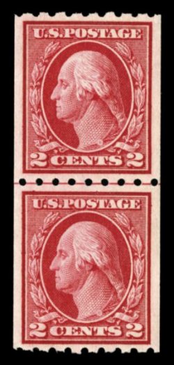 504 nh 393 var. image#393 var., 2c Carmine coil, perf. 8 1/2 vert., paste-up pair, overall well centered, strong rich color, o.g., n.h., very fine and nice variety of the early coil issues that were made by hand. (Image) $275.00