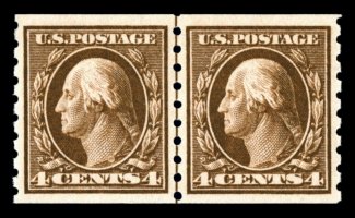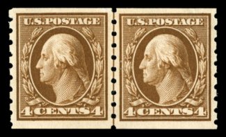 507 ogu 395 image#395, 4c Brown coil, perf. 8 1/2 vert., guide line pair, exceedingly well centered within very large margins, perfectly positioned guide line between the two stamps, gloriously rich color and a strong sharp impression, o.g., lightly hinged, extremely fine; a particularly choice example of this coil line pair; 2005 PSE certificate (XF 90; SMQ $620.00). (Image) $475.00
