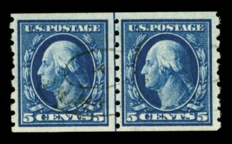 508 O 396 image#396, 5c Blue coil, perf. 8 1/2 vert., used guide line pair, particularly well centered, deep rich color and a strong impression on bright paper, light central strike of a double oval cancel, a very fine example of this very scarce used line pair; 2003 PF certificate. (Image) $750.00