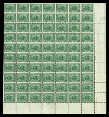 510 nhbl 397 image#397, 1c Panama-Pacific, bottom right plate no. 6128 sheet of 70 including bottom and right plate blocks, few crimped and separated perfs. clear of the plate blocks, o.g., n.h., fine centering. (Image) $3,360.00
