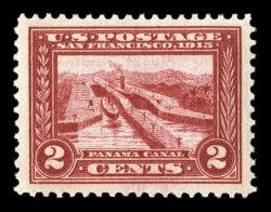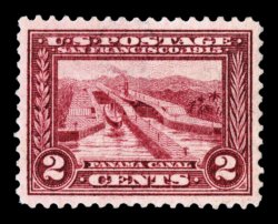 512 og 398a image#398a, 2c Panama-Pacific, the carmine lake shade variety, a remarkably well centered example of this rare color variety, as the vast majority are centered to the right (often quite strongly), rich carmine lake color, o.g., lightly hinged, light diagonal crease, extremely fine appearance; 1991 PSE certificate as the Lake shade of #398. (Image) $1,500.00