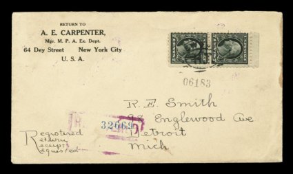 581 EDU 469 image#469, 7c Black, top margin fine vertical pair, tied to registered return-receipt cover by New York Hudson Terminal Station oval, February 19, 1917 earliest documented usage with registry c.d.s. of that station on the reverse, backstamped Detroit the next day, stamps lifted for identification, very fine cover; 2003 APS certificate; ex-"Alpha". (Image) Est. 750-1,000