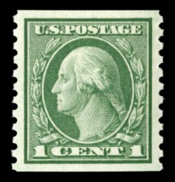 582 nhu 452 image#452, 1c Green rotary coil, perf. 10 vert., superb mint single, possessing perfect centering and outlandish margins, deep rich color and a crisp impression, immaculate o.g., n.h., extremely fine; almost never encountered in such premium condition; 2006 PSE certificate (Superb 98; SMQ $135.00); the only single awarded this lofty grade. (Image) $21.00