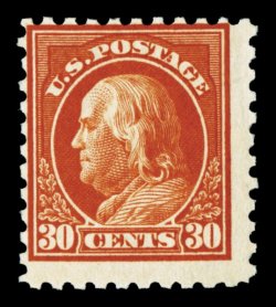 588 nh 476A image#476A, 30c Orange red, the extremely rare unwatermarked, perforated 10 issue, position 79 from plate no. 6917 sheet, deep vibrant color and an unusually strong impression, typical centering for this notoriously difficult stamp, o.g., n.h., fine; a key 20th century rarity, with only two sheets (200 stamps total) ever discovered; 1972 PF certificate. (Image) $9,000.00