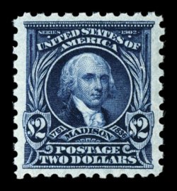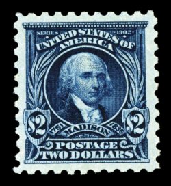 592 nhu 479 image#479, $2.00 Dark blue, an exceedingly choice mint example, featuring extraordinary centering amid wide margins, deep prooflike color and impression, unblemished o.g., n.h., an extremely fine gem; 2006 PSE certificate (XF-Superb 95; SMQ $2,250.00). (Image) $550.00