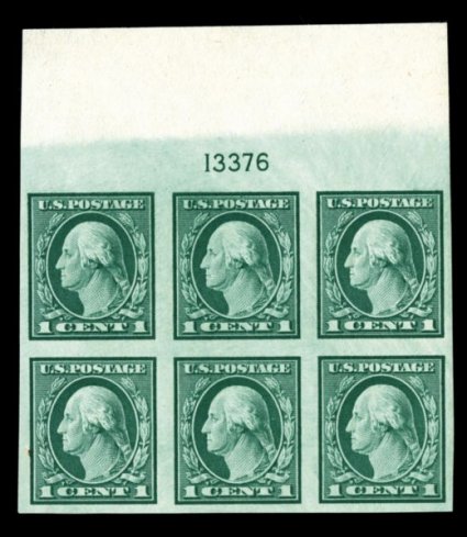 596 ogPB 481 image#481, 1c Green imperforate, experimental electrolytic plate printing, wonderfully choice full top margin plate no. 13376 block of six, with this particular plate number (and 13377) being unique to this seldom seen experimental printing, sumptuously rich color, large margins all around, o.g., four stamps n.h., two center stamps lightly hinged, extremely fine; a plate block which is seldom offered at auction, particularly as a full top, and quite undercataloged; ex-Fogelson. (Image) $375.00