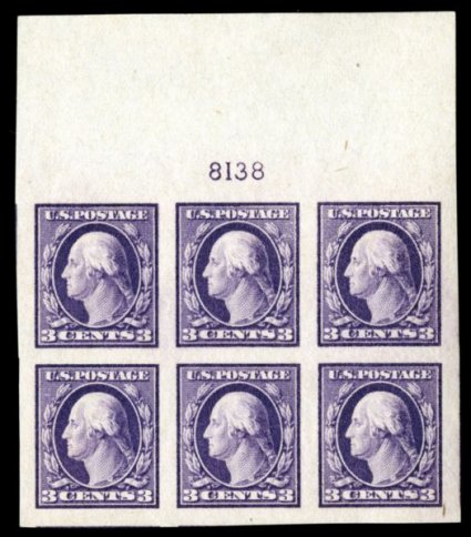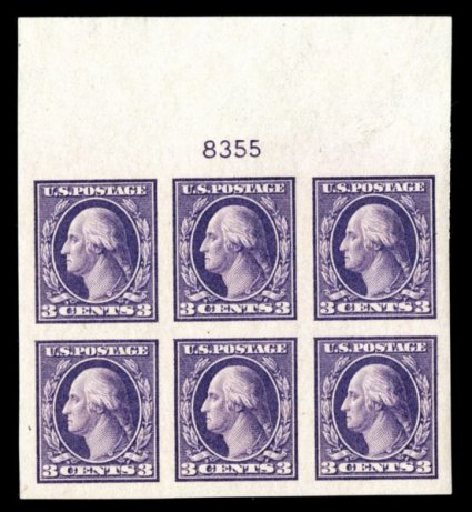 597 nhPB 483 image#483, 3c Violet, Ty. I, imperforate, choice full top margin plate no. 8355 block of six, featuring amazingly large and wonderfully well balanced margins all around, prooflike color and impression, o.g., n.h., extremely fine and quite handsome. (Image) $190.00