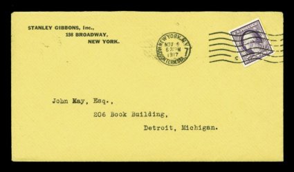 598 EDU 483 image#483, 3c Violet imperforate, remarkably attractive and well margined single with fresh bright color and impression (stamp lifted for identification), neatly tied to yellow Stanley Gibbons of New York corner card cover by New York, N.Y., Hudson Terminal Station machine cancel, November 8, 1917 earliest documented usage for this sheet imperforate, this is less than a month later than the reported October 13th issuance date, posted to John Kay, the famous Detroit collector, extremely fine; ex-"Alpha". (Image) Est. 1,000-1,500