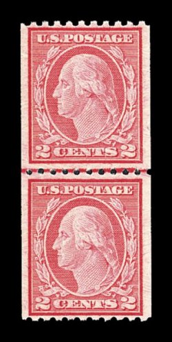 600 nh 486, 487 image#486, 487, 1c Green and 2c Carmine, Ty. II coils, joint line pair of each, exceptionally well centered, strong colors, o.g., n.h., extremely fine; 1c with 2004 PF certificate, 2c with 1994 PF certificate. (Image) $219.50