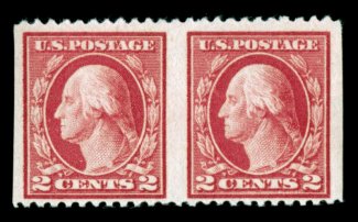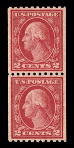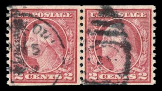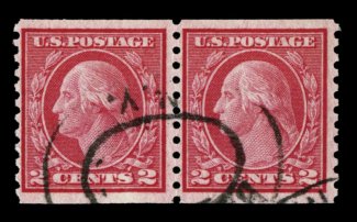 603 O 491 image#491, 2c Carmine coil, Ty. II, perf. 10 vert., choice used pair, unusually well centered within large margins, intensely rich color in the characteristic carmine shade, strong impression, St. Louis duplex postmark, choice very fine; used pairs of this coil are greatly undercataloged, as they are offered with far less frequency than mint pairs, which carry a catalog value of $5,250.00, and it is particularly challenging to find a used pair in this select quality; 2006 PF certificate. (Image) $3,750.00