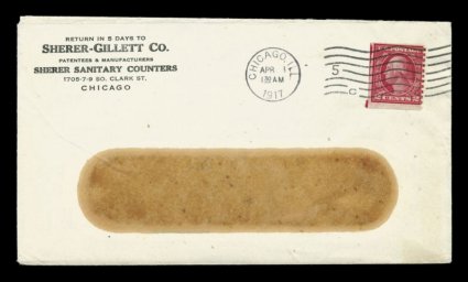 605 EDU 492 image#492, 2c Carmine coil, Ty. III, perf. 10 vert., single with portion of joint line showing at right (clipped perforations from vending machine or affixing device), tied to window envelope of Sherer-Gillett Co. with illustration on the reverse, stamp tied by Chicago, Ill. machine cancel, April 1, 1917 earliest documented usage, stamp lifted for identification and hinged in place, very fine cover; 2004 APS certificate; ex-"Alpha". (Image) Est. 750-1,000