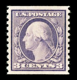 606 nhu 493 image#493, 3c Violet coil, Ty. I, perf. 10 vert., gem mint single, precisely centered within large margins, bright fresh color, pristine o.g., n.h., extremely fine; a terribly challenging coil to find so choice; 2005 PSE certificate (Superb 98; SMQ $245.00). (Image) $30.00