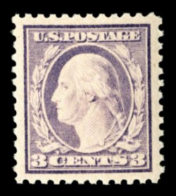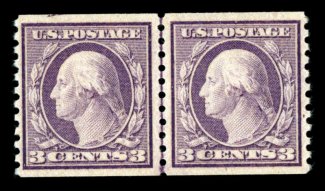 607 nh 493 image#493, 3c Violet coil, Ty. I, perf. 10 vert., joint line pair, extraordinarily bright and fresh, marvelously well centered amid uncharacteristically large margins, pristine o.g., n.h., extremely fine; an unusually challenging line pair to find in this gem quality; ex-"Piedmont", McCree. (Image) $230.00