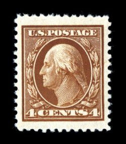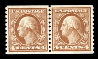 608 nh 495 image#495, 4c Orange brown coil, perf. 10 vert., an essentially "perfect" mint joint line pair, possessing mathematically precise centering amid extravagantly large margins which are most uncharacteristic of this, gorgeous bright color and a crisp detailed impression, pristine o.g., n.h., extremely fine; a gem line pair for the perfectionist; ex-McCree. (Image) $160.00