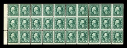 610 nhBP 498f image#498f, 1c Green A.E.F. booklet pane of thirty, uncharacteristically well centered, strong rich color, o.g., n.h., some minor natural gum wrinkles and a small natural gum crease at bottom right, one stamp in the top row with two small spots on the gum, otherwise a very fine example of this scarce booklet pane. (Image) $1,700.00