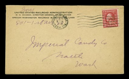 612 EDU 500 image#500, 2c Deep rose, Ty. Ia, a distinctive single in the characteristic deep rose shade of the Ty. Ia , natural s.e. at top with guide line, plus perforated initials "OW/RN of the Oregon-Washington Railroad and Navigation Lines, on United States Railroad Administration corner card cover, tied by Seattle, Wash. Terminal Station machine cancel dated December 15, 1919, the earliest documented usage, used locally within Seattle, clean and attractive cover, very fine; the date of issue is not known on this issue because this type variety came about in the normal production of the already issued 2c stamps through an experiment in 1919 using ten subject dies and transfer rolls rather than single subject devices, often unrecognized, collectors have found them to be of considerably scarcity and particularly so on cover, a lovely example of this difficult stamp on cover and enhanced by being the earliest documented usage; 1998 PSE certificate; ex-"Alpha". (Image) Est. 1,000-1,500