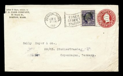 614 EDU 501 image#501, 3c Violet, Ty. I, single with quite deep color, tied to 2c Carmine on white postal entire (#U429) by Boston, Mass. slogan flag type machine cancel, June 5, 1917 earliest documented usage, posted to Denmark with censor label on the reverse, backstamped Copenhagen, cover opened for display with backflap slightly reduced and edge wrinkles not affecting the stamp, fine; ex-"Alpha". (Image) Est. 500-750