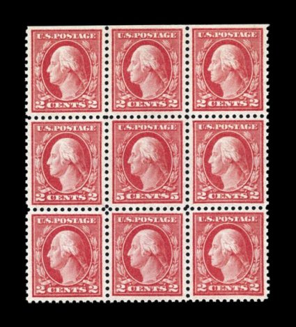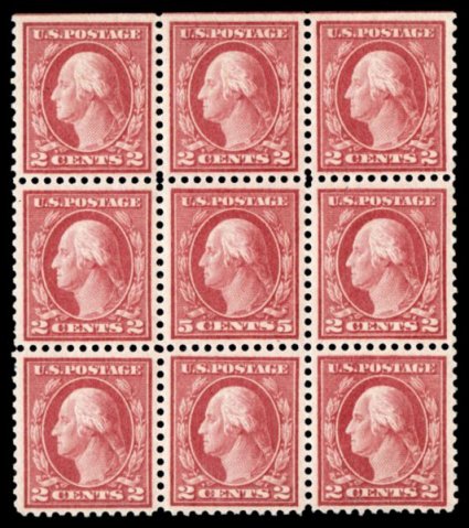 619 nhbl 505 image#505, 5c Rose error, single error in a block of nine, the error stamp is marvelously well centered within large margins, bright and fresh, o.g., n.h., natural flat plate crease affects the bottom left 2c stamp only and is mentioned for strict accuracy, extremely fine; an especially choice and desirable error block; clear 2004 PF certificate. (Image) $1,150.00