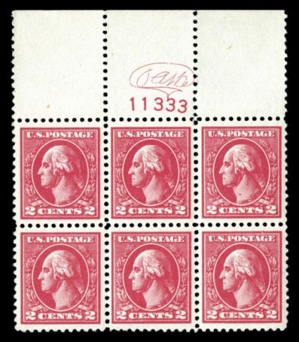 648 nhPB 532 image#532, 2c Carmine rose, Ty. IV, full top margin plate no. 10918 block of six, with an extra-large sheet margin, other margins are large and balanced as well, deep rich color, unblemished o.g., n.h., extremely fine. (Image) $625.00