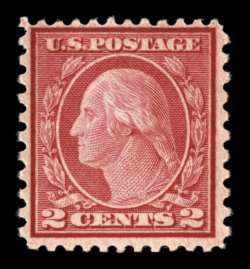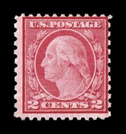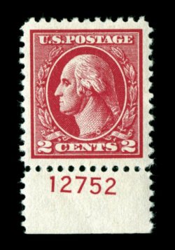 645 nh 528B image#528B, 2c Carmine offset, Ty. VII, bottom sheet-margin plate no. 12752 single, featuring enormously large margins all around and being wonderfully well centered within them, intense color and impression on bright paper, pristine o.g., n.h., an extremely fine jumbo. (Image) $47.50