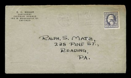 646 EDU 529 image#529, 3c Violet offset, Ty.III, single tied to corner card cover of E.C. Segar, Cartoonist, Chicago Herald, posted to Reading, Pa., Apr. 8, 1918 earliest documented usage, stamp tied by Chicago, Ill. machine cancel, some edge wear and discoloration slightly affecting the stamp, fine and early cover as Johl reported the issuance date as March 23rd; because of the Scott order and the attention drawn to the different types of the 2c offset issues few realize that this 3c value was issued almost exactly two years prior to the first 2c value; clear 2000 APS certificate; ex-"Alpha". (Image) Est. 500-750