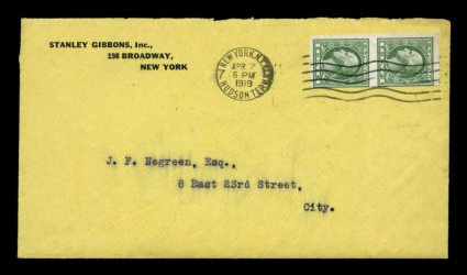 647 EDU 531 image#531, 1c Green offset imperforate, vertical pair paying the 2c wartime drop letter rate, tied to Stanley Gibbons, Inc. of New York corner card cover by New York, N.Y. Hudson Terminal Station machine cancel, April 7, 1919 earliest documented usage on cover, posted within the city, backflap missing, otherwise very fine; 2004 APS certificate; ex-"Alpha". (Image) Est. 500-750